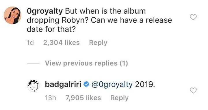 Rihanna’s last album “Anti’” was released in 2016. On Friday Rihanna teased her fans with the release date of her new album. A fan asked a question on Rihanna’s Instagram in regards to her new album dropping, Rih responded “2019,” the “Work.”